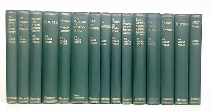The Works. 15 Vol. London, Methuen, 1914-1922. 8°. 320 p., 179 p., 352 p., 244 p., 263 p.,160 p., 181 p., 183 p., 180 p., 205 p., 156 p., 218 p., 182 p., 246 p., 196 p., orig. green cloth boards, gilt lettering. - 1. Poems. 15th ed. 1921. - 2. A House of Pomegranates. 10th ed. 1921. - 3. The Picture of Dorian Gray. 2nd ed. 1913. - 4. Essays and Lectures. 5th ed. 1920. - 5. Intentions. 14th ed. 1921. - 6. Selectes Prose. First ed. 1914. - 7. The Importance of being earnest. 13th ed. 1919. - 8. The Duchess of Padua. A play. 5th ed. 1916. - 9. Salomé. 7th ed. 1921. - 10. Art and Decoration. Being extracts from reviews and miscellanies. 1st ed. 1920. - 11. De Profundis. 14th ed. 1922. - 12. A critic in pall mall. First ed. 1919. - 13. A Woman of no importance. 9th edition. 1920. - 14. An ideal husband. A play. 13th ed. 1919. - 15. Lord Arthur Savile's crime. The Portrit of Mr. W.H. and other stories. Very good and clean condition.